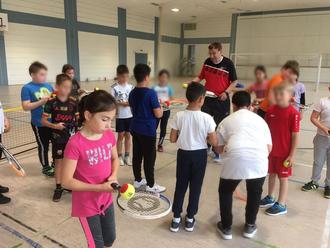 Auf dem abschließenden Schulfest konnten die Kids ihren Eltern das Gelernte nochmal vorführen. Unterstützt wurde unsere Jugendwartin dabei von unserem Sportwart Jochen Strater sowie unserem U10-Spieler Elijah Sari.