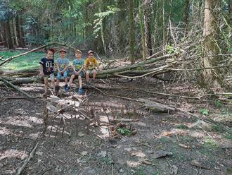 Die Kinder hatten viel Spaß und lernten nebenbei etwas über Statik, etc., denn es ist gar nicht leicht, ein Dach auf ein Haus zu bauen, wenn die Mauern aus, senkrecht in den Boden gesteckten, Ästen bestehen.