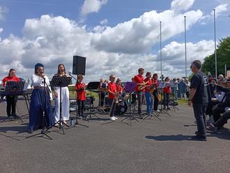 Die Bigband des Gymnasium Michelstadt war am Himmelfahrtstag bei einem besonderen Ereignis im Einsatz: Die evangelische Stadtkirchengemeinde Michelstadt feierte am Flugplatz Michelstadt „Waldhorn“ einen OpenAir-Gottesdienst mit etwa 300 Besuchern. Im Anschluss an diesen Gottesdienst sorgte die GyMi-Bigband etwa eine gute halbe Stunde lang für musikalische Umrahmung. Passenderweise kam ein exklusiv arrangiertes Gospelmedley zur Aufführung, aber auch Highlights wie „What A Wonderful World“, zwei Beatles-Klassiker sowie die Rockhits „The Eye Of The Tiger“ und „Summer In The City“ sorgten für gute Unterhaltung der zahlreichen Gäste. Zum Abschluss erklang der Welthit „We Are The World“, was Begeisterungsstürme des Publikums zur Folge hatte.