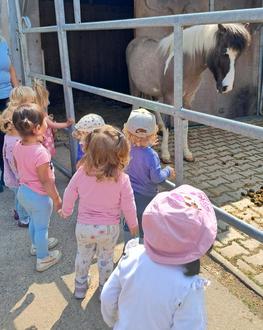 Die Kinder des Krippenhauses „Grüner Weg“ aus dem Höchster Ortsteil Hassenroth besuchten am 02.06.25 die Islandpferde vom Blitzberg.