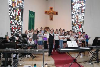 Am Freitagabend gab es in der katholischen Kirche in Höchst ganz andere Töne als gewöhnlich zu hören. Statt der klassischen Kirchenlieder aus dem Gesangbuch ertönten das rockige „Eye oft he tiger“ oder das sommerlich entspannte „Quantanamera“. Was war los? Die Ernst-Göbel-Schule hatte zum Sommerkonzert unter Leitung von Alexander Th. Link eingeladen. Da beim letzten Konzert die Aula der Ernst-Göbel-Schule schon zu klein war, durften die jungen Künstler in der Kirche musizieren, was sich auch in Bezug auf die Akustik als sehr vorteilhaft erwies. Passend zur Jahreszeit begann der Chor der 5. Klassen mit dem Titel „Lass die Sonne in dein Herz“. Wer die über dreißig jungen Schüler und Schülerinnen erlebte, dem fiel das nicht schwer, denn die Begeisterung für die Musik, aber auch ein enormes gesangliches Können zeigten sich sofort. Die Schulband MUSIX steht schon seit langer Zeit für rockige Songs, traf aber mit „Strangers in the night“ ebenso gekonnt die leisen Töne. Der Coro belcanto überzeugte mit „Over my head“. Bei allen drei Gruppen wurde deutlich, mit welcher Hingabe sie ihre Lieder zum Besten gaben. So wundert es nicht, dass die gute Stimmung sich auf das zahlreich erschienene Publikum übertrug, das häufig mitklatschte und die jungen Künstler mit viel Beifall bedachte. Der berühmte Antikriegssong „Sag mir, wo die Blumen sind“ erinnert mit seiner traurigen Aktualität daran, dass Frieden ein kostbares Gut ist. Sommerlich heiter ging es mit „El Condor Pasa“ weiter. Eine beeindruckende Leistung boten die 5. Klassen bei dem Song “The earth is my mother“, bei dem Alexander Th. Link kleine Verszeilen zum Thema Umweltschutz vorlas.