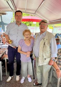 Die ältesten Teilnehmer, Frau Gerda Brohm und Herr Philipp Bäcker mit Bürgermeister Jens Fröhlich.