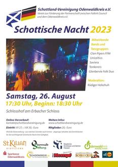 Erbach. Die Schottlandvereinigung Odenwaldkreis e.V. veranstaltet dieses Jahr erneut die Schottische Nacht im Erbacher Schloss Hof. Am Samstag, den 26. August 2023 wird es wieder ein aufregendes und buntes Bühnenprogramm mit verschiedenen Bands und Tanzgruppen geben. Einlass ist um 17:30 Uhr, Beginn der Veranstaltung ist um 18:30 Uhr.