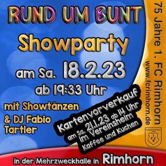 Zur unser Showparty am Samstag, den 18.2.2023 um 19:33 Uhr laden wir Euch ein. Unter dem Motto „Rund um Bunt“ seht Ihr beim 1. FC Rimhorn ein Programm mit Showtänzen, Gardetänzen und dem Männerballett. Für Party-Stimmung sorgt DJ Fabio Tartler. Der Einlass in der Mehrweckhalle in Rimhorn ist bei freier Platzwahl ab 18:33 Uhr.