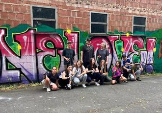 Das Ergebnis einer gelungenen Gruppenarbeit und Sensibilisierung für Diversität spiegelt sich auch in dem bunten Schriftzug „oneLove“ wider. Die Bäume symbolisieren den Bezug zum Odenwald und der ländlichen Umgebung. Gemeinsam wurde über die Inhalte abgestimmt und darüber entschieden, welches Wort auf die Wand gesprüht wird und in welchem Stil die Buchstaben dargestellt werden können. Dabei brachten die Graffiti-Sprüher ihre künstlerische Expertise ein und arbeiteten Hand in Hand mit den Schülerinnen und Schülern, um die Entwürfe zunächst auf Papier zu bringen. Neben zwei erfahrenen Graffiti-Künstlern wurde die 10-köpfige Gruppe von Mitarbeitenden des Jugendtreffs Höchst sowie der evangelischen schulbezogenen Jugendarbeiterin Eva Heldmann unterstützt und begleitet.