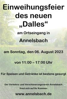 Wie bereits in der letzten Woche angekündigt lädt der Verkehrs- und Verschönerungsverein ein zu einer Einweihungsfeier am Sonntag, den 06.08.2023 von 11:00 - 17:00 Uhr am Ortseingang von Annelsbach.