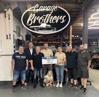 Das Bild zeigt (v. l. n. r): Thomas Eckhardt von der Kleinen Schänke Am Fischbrunnen, Bürgermeister Jens Fröhlich, Holger Heim Serviceleiter vom Treffpunkt Thierolf, Dennis Zessin vom Gewerbeverein und KiBet, 2. Vorsitzende Celine Marquard von KiBet sowie Jens und Martin Jarosch von den GARAGE BROTHERS
