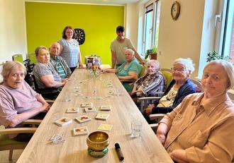 Corina Mayer (hinten links) und Cindy Lade (hinten rechts) zusammen mit einer MAKS®-Therapiegruppe bei einer Runde „Vertellekes“: einem Erzählspiel für Senioren, das durch Impulskarten hilft, Erinnerungen zu wecken, Gespräche anzuregen und so spielerisch die Kommunikation und das soziale Miteinander zu fördern. (Foto: I. Muntermann / GZO)