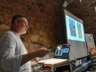 Thomas Heß und auf der Leinwand das Grab von Friedrich Veith früher und heute