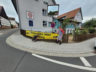 SPD Fraktionsvorsitzender Karl-Heinz Amos beim bestigen des Transparent am Ortseingang von Hassenroth.