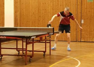 Peter Rüthers (hier beim Rückhand-Aufschlag) gewinnt gegen Langen-Brombach IV beide Einzel sowie sein Doppel mit Leonard Schmidt