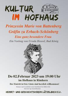 Der nächste Vortrag in der Reihe des Heimat- und Geschichtsvereins Lützelbach „Kultur im Hofhaus“ widmet sich einer ganz besonderen Frau: Prinzessin Marie von Battenberg, Gräfin zu Erbach-Schönberg. Gästeführerin Ursula Heusel aus Lützelbach-Rimhorn stellt in ihrem Vortrag am Donnerstag, den 2. Februar 2023 um 19 Uhr in Lützelbach-Rimhorn, Rathausstraße 29.