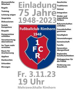 Der 1. FC Rimhorn lädt alle Mitglieder, Freunde und Gönner zu der Jubiläumsfeier am Freitag, den 3. November 2023 um 19 Uhr in die Mehrzweckhalle Rimhorn ein.