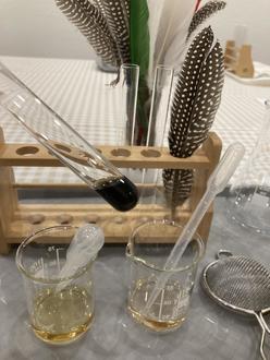 Wir stellen “Ewigkeitstinte” her und schreiben mit Federn. Versilbern von Glas!
