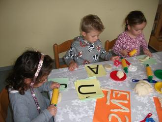 In der Kita Steinmetzstraße haben wir mit den Kindern ein Banner gestaltet und aufgehängt, sowie Buchstaben aus selbstgemachter Knetmasse geformt. Den Kindern hat es großen Spaß gemacht und viele Sprachanlässe in kleinen Gruppen geboten.