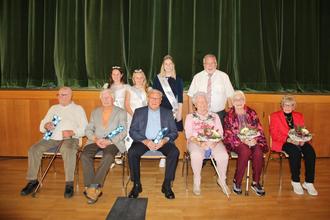 Ehrung der ältesten Teilnehmerinnen und Teilnehmer des Seniorennachmittags der Gemeinde Höchst i. Odw.: V.l.n.r. Philipp Bäcker, August Muche, Helmut Wolf, Elfriede Diehl, Anneliese Schnetz und Anna Mengler dahinter Bürgermeister Horst Bitsch und die Apfelblütenkönigin Johanna I. mit ihren Prinzessinnen Elena und Sophia