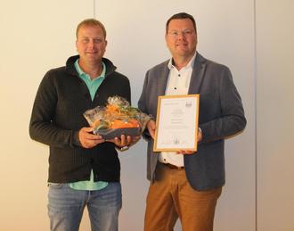 Bürgermeister Jens Fröhlich gratulierte Dennis Zessin herzlich zu seinem Jubiläum und dankte ihm für sein langjähriges Engagement und seine zuverlässige Arbeit im Dienst der Gemeindeverwaltung. Als Zeichen der Wertschätzung überreichte er eine Urkunde sowie ein Präsent.