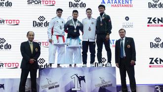Die besten der Welt – Siegerehrung der Jugend Jungen in der Disziplin Kata Einzel, auf dem Siegerpodest v.li.n.re.: Jonas Ab Wahib (Deutschland), Ukyo Tatsumi (Japan), Alexandru Nicolas Modi (Rumänien) und Kento Oiwa (Australien) mit dem bayerischen WKF-Vizepräsidenten Wolfgang Weigert (rechts außen)