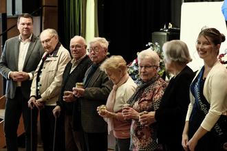 Ehrung der ältesten Teilnehmerinnen und Teilnehmer des Seniorennachmittags der Gemeinde Höchst i. Odw.: V.l.n.r. Bürgermeister Jens Fröhlich, Gottfried Matiaske, Philipp Bäcker, August Muche, Gerda Brohm, Lydia Rummel, Erna Heinrigs, Apfelblütenkönigin Chiara I.