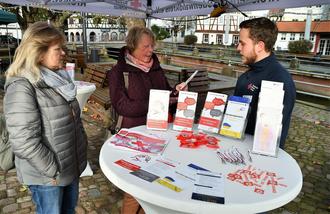 Bei einem Außentermin auf dem Marktplatz in Erbach haben die Mitarbeitenden der neuen DRK-Servicezentrale am vergangenen Samstag zwischen 13 und 18 Uhr das umfangreiche Angebot ihrer Arbeit der Öffentlichkeit vorgestellt. Besonderes Interesse zeigten die Besucher an den Themen Migration und Integration, mit denen sich der Wohlfahrtsverband aktuell in der Ukrainehilfe engagiert. Hier gibt der DRK-Kreisverband Odenwaldkreis Unterstützung im Umgang mit Anträgen und Formularen bei Behörden, wozu auch das Beantragen diverser Sozialleistungen für die Neuankömmlinge gehört, hilft bei der Kontaktaufnahme zu Ärzten und der allgemeinen medizinischen Versorgung und engagiert sich im Einvernehmen bei schulischen und beruflichen Fragen. Im persönlichen Gespräch ist ebenso die Beratung bei familiären Problemen möglich. Diese Aufgaben übernehmen geschulte Sozialarbeiterinnen und Sozialarbeiter des Wohlfahrtsverbandes, die hier ihre Erfahrungen und ihr Wissen einbringen. Die Hilfestellung zu Weiterbildungs- und Qualifikationsmöglichkeiten zählt ebenso zum umfangreichen Aufgabengebiet, wie die Vermittlung an andere Fachstellen oder die Auswahl von Laiendolmetschern. Zum allgemeinen Austausch mit anderen Geflüchteten bietet das Rote Kreuz jeden Dienstag zwischen 16 und 17.30 Uhr in seinen Räumlichkeiten am Stockheimer Ring 13 in Michelstadt ein Zusammensein im geschützten Raum bei Kaffee und Kuchen an. Ebenso hatten die Sozialarbeiter Marlon Silberzahn und Darja Witmaier Wissenswertes zu den Bereichen der DRK-Suchthilfe, der DRK-Selbsthilfe, der Suchtvorbeugung und dem Betreuten Wohnen sowie zum Freiwilligen Sozialen Jahr (FSJ) beim Roten Kreuz im informativen Gepäck. Zusätzlich konnten sich die Besucher über Notrufsysteme für ältere Mitbürger informieren. Allgemeine Fragen zu den Arbeitsbereichen des DRK hat Mitarbeiter Werner Boer beantwortet.