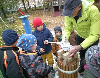 Bei schönem Herbstwetter hat uns Herr Hofferbert von der Umweltorganisation BUND OV Höchst-Breuberg in der Kita besucht. Die Kinder konnten selbst miterleben wie aus einem Apfel Saft gewonnen wird. Zuerst wurden die Äpfel geschreddert und dann in einer Kelter mit viel Muskelkraft ausgepresst.