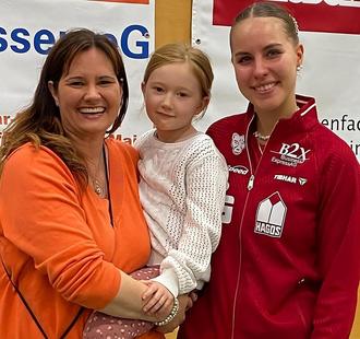 Spitzenspielerin Annett Kaufmann (19) rechts nach dem Sieg mit zwei glücklichen Fans
