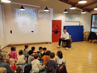 Am Vormittag wurde der Bürgermeister von den Kindern herzlich empfangen. Nach einer kurzen Begrüßung nahm Herr Fröhlich Platz und entführte die jungen Zuhörer in die Welt des Bilderbuchs „Flausch“. Mit großer Hingabe und lebendiger Erzählweise erweckte er die Geschichte zum Leben und fesselte die Kinder von der ersten bis zur letzten Seite.