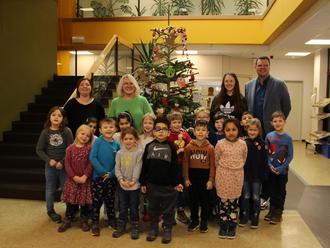 Beigeordneter Jens Fröhlich bedankte sich bei den Kindern und Erzieherinnen der Kindertagesstätte „Steinmetzstraße“ für die Dekoration des Weihnachtsbaumes im Rathaus und lud die Kinder zu einem kleinen Umtrunk und Weihnachtsgebäck ein.