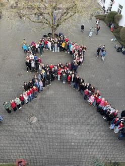 Als Höhepunkt der Woche stellten sich am vergangenen Donnerstag über 100 Schülerinnen, Schüler und Lehrkräfte auf den C-Hof des Gymnasiums, um die lebendige AIDS-Schleife zu bilden. Damit zeigt das Gymnasium seine Solidarität und macht auf die Bedeutung des Themas AIDS aufmerksam.
