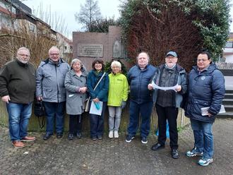 Einige der aktiven Mitglieder der Arbeitsgruppe „Stolpersteine für Höchst“ bei ihrem Arbeitstreffen am Gedenkstein der ehemaligen jüdischen Synagoge in Höchst i. Odw. von rechts nach links: Harald Staier, Hans Hofferberth, Lothar Lammer, Gudrun Keller, Sigrid-Maline Thierolf-Jöckel, Dr. Monika Giesen-Wiese, Günter Bittner sowie Bürgermeister Horst Bitsch.