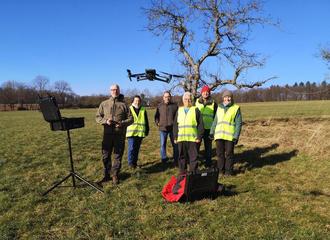 Von links: Marc Deivel Fa. Isadrone, Nicole Tack (Rehkitzrettung nördlicher Odenwald e.V. -RenO e.V.-), Joachim Olt (Jagdgenossenschaft Rimhorn), Willi Bohr, Hanno König und Johanna Fruhner-Gruber (alle RenO e.V.)