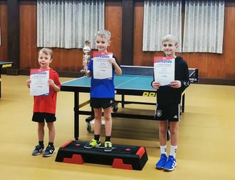 Siegerehrung der Altersklasse U9 mit v. l. n. r.: Theo Knorr (TSV Höchst), Max Damm (TTC Langen-Brombach) und Luka Daum (TV Wersau)