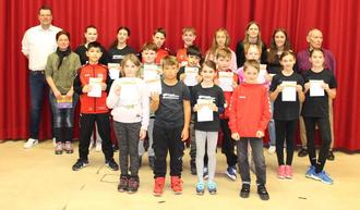 Zum ersten Mal durften Max Stubenrauch (Silber) und Viktoria Fuchs (Gold) die Auszeichnung entgegen nehmen. Das zweite Sportabzeichen absolvierte Octavian Sipos in Bronze. Silber ging an Fynn Berger, Pillip Pfannmüller und Lenny Cima. Die Bedingungen für Gold haben Polina Hordiienko, Hannes Zahn und Elyesa Cayir erfüllt. Ihr drittes Abzeichen erhielten Nika Köhler und Marisa Schmucker in Silber während Johanna Schäfer, Jonas Burzynski und Juna Köhler Gold erreichten. Zum vierten Mal wurde Felix Schmucker ausgezeichnet (Silber). Gold erhielten Nele Endler und Sophia Schäfer. Ihre fünfte Wiederholdung in Gold legten Leonhard Schmidt, Adrian Geist und Paula Schmucker ab. Das sechste Sportabzeichen konnte Marie Fröhlich in Bronze in Empfang nehmen. Zum neunten Mal haben Fynn Langnickel (Silber) und Hanna Endler (Gold) die Auszeichnung erhalten. Eine besondere Leistung ist das 10. Sportabzeichen in Gold von Anneke Brinkmann.