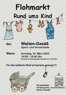 Am Sonntag, dem 19.03.2023 veranstaltet der Kindergarten Weiten-Gesäß in der örtlichen Sport- und Vereinshalle von 14:00 Uhr bis 16:30 Uhr den beliebten Flohmarkt „Rund ums Kind“.