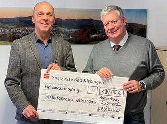 Regierungsdirektor Axel Grzeszkowiak, Leiter des Bundeswehrdienstleistungszentrums Hammelburg, überreicht Bürgermeistermeister Gerd Kleinhenz anlässlich eines Besuchs im Rathaus einen Scheck, der aus dem Teilerlös einer Tombola stammt. Seit Jahren organisiert das BwDlZ ein Weinfest für geladene Gäste mit einer Tombola, deren Erlös für gemeinnützige Zwecke gespendet wird.