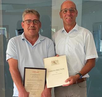 Anlässlich einer kleinen Feierstunde im Kreise seiner Mitarbeiterinnen und Mitarbeiter überreicht Bürgermeister Gerd Kleinhenz die Urkunde des Marktes Wildflecken sowie die Ehrenurkunde des Freistaates Bayern an den Chef der Liegenschaftsabteilung Ralf Losert.