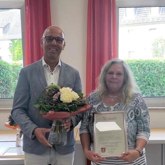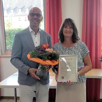 Bürgermeister Gerd Kleinhenz ehrte Frau Monika Kleinhenz-Béke mit einer Dankurkunde für 40 Jahre geleisteten Dienst im Rathaus. Frau Kleinhenz-Béke kam im April 1984, zunächst befristet als Mutterschaftsvertretung, in die Verwaltung und wurde nach Abschluss dieser Zeit im Team fest übernommen. In dieser Zeit hat sie einige Bereiche innerhalb der Verwaltung, wie z.B. die Sozialhilfeverwaltung, die seinerzeit noch im Rathaus angesiedelte Bibliothek und die Grund- und Gewerbesteuerabteilung sowie die Vertretung im Einwohnermeldeamt innegehabt. Die längste Zeit hat sie im Vorzimmer des Bürgermeisters und des Geschäftsleiters verbracht - dort ist sie auch heute noch tätig. Seit ihrer Dienstzeit hat sie mit drei Bürgermeistern und Geschäftsleitern zusammengearbeitet.