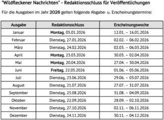 Damit unser Gemeindeblatt pünktlich erscheinen kann, bitten wir die Vereine und örtliche Institutionen, ihre Beiträge rechtzeitig einzureichen. In der folgenden Tabelle finden Sie die Redaktionsschlusstermine für das Jahr 2026.