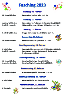 | SCK Oberwildflecken: | Kinderfasching im Sportheim, 14:00 Uhr |
