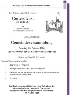 09:30 Uhr Gottesdienst mit Dekan Till Roth und Prädikantin Christine Gehrlein, anschl. Gemeindeversammlung (siehe Plakat)