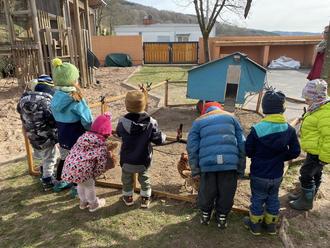 Zwei Wochen lang vom 20.03 -31.03.2023 beheimateten ganz besondere Gäste den Kindergarten Oberbach. So haben wir vom „Hühnerstall Huhnolulu aus Gersfeld“, sieben Hühner, ein Hühnerhaus, ein Gehege und reichlich Futter und Stroh zur Verfügung gestellt bekommen, damit die Kinder die Tiere intensiv erleben und wahrnehmen konnten.