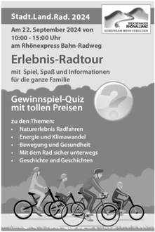 Am 22. September 2024 findet von 10 bis 15 Uhr im Rahmen des Aktionstags "Stadt.Land.Rad" eine Erlebnis-Fahrradtour entlang des Rhön-Express Bahnradweges statt. Dieser besondere Tag zielt darauf ab, das Bewusstsein für Energie und Klimawandel zu fördern und gleichzeitig Bewegung, Gesundheit und Sicherheit auf dem Fahrrad zu thematisieren. Die Veranstaltung bietet Spiel, Spaß und Informationen für die ganze Familie und die Möglichkeit, die schöne Natur des Sinntals auf dem Rad bewusst zu erleben.
