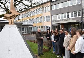 Symbol für Freiheit: die Pyramide des Perseus von Bernd Rosenheim vor dem Landratsamt. Landrat Frank Matiaske und Kulturmanagerin Ute Naas tauschen sich mit Auszubildenden über das Kunstwerk aus.