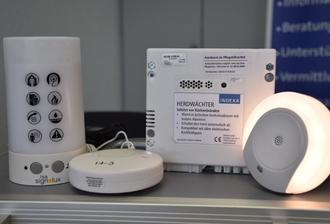 Drei Beispiele aus dem Koffer: ein Gerät, das mittels Ton- und Lichtsignalen unter anderem anzeigt, ob jemand klingelt, das Telefon läutet oder ein Rauchmelder Alarm schlägt (links). Angeschlossen werden kann auch ein kleines Vibrationskissen (rechts daneben), das Bettlägerige aufwecken kann. Ein „Herdwächter“ warnt vor Überhitzung und kann einen Herd auch abschalten. Diese Geräte können von der Pflegekasse bezahlt werden. Daneben gibt es auch viele nützliche Beleuchtungssysteme.