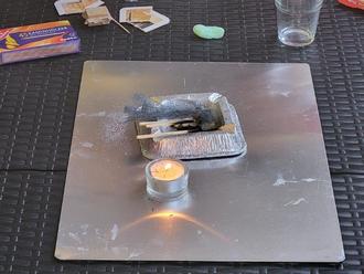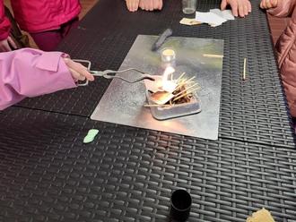 Damit die Experimente gefahrlos durchgeführt werden konnten haben sich alle mit langen Haaren erstmal einen Zopf gebunden, damit keine echten Haare Feuer fangen. Dann wurde an jedem Versuchstisch eine Sprühflasche mit Wasser bereitgestellt, damit sofort gelöscht werden kann. Außerdem wurde noch eine Löschdecke bereitgelegt. Dann ging es auch endlich los indem alle erstmal geübt haben wie man ein Streichholz richtig anzündet und auch wieder ablöscht.