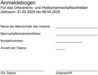 Nach der großen Resonanz der beiden Vorjahre findet nun auch in diesem Jahr wieder ein Orts- und Hobbymannschaftsschießen für Luftgewehr statt. Der vorgesehene Zeitraum ist in der Woche vom 31.03.-06.04.2025.