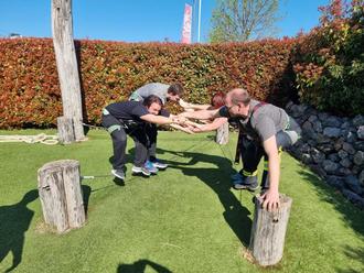 Als die Kletterhalle bezwungen war ging es zu einer vermeintlichen Pause. Diese war jedoch ein kurz scheinender Parcours, der nur im Team bestritten werden konnte. Mit vielen helfenden Händen und so manchem kleinen Absturz konnte das Team die Aufgabe bewältigen und hatten sich danach eine Pause verdient. Hier gab es leckeres Laugengebäck und Quarkteilchen, die Gemeindebrandinspektor Stephan Fehr für seine Absturzsicherungsleute besorgt hatte.