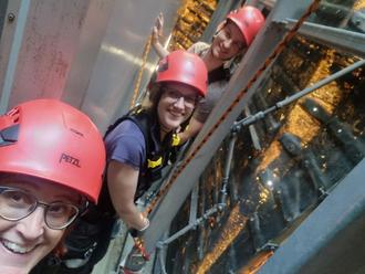 Nachdem die ersten Kletterversuche an den einfachen Routen unter Anleitung des Ausbilders erfolgreich waren, durften sich die frisch gebackenen Kletterer eine Route zum Klettern aussuchen. Schnell stellten alle fest, dass die Jungs und Mädels der Absturzsicherung keine Angst vor der Höhe haben und so ging es immer wieder hoch hinaus bis an die Hallendecke.