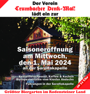 Der Verein „Crumbacher Denk-Mal!“ lädt wie jedes Jahr zur Saisoneröffnung ab 11.00 Uhr in den Park an der Saroltakapelle alle Mitglieder, Crumbacher und Gäste aus nah und fern ein. Neben dem Klassiker, der traditionellen Kesselfleischwurst, gibt es noch Rindswurst, Schinkengriebenschmalz, Kaffee und leckeren Kuchen. Natürlich darf das beliebte Andechser Bier vomHeiligen Bergnicht fehlen. Aber auch Apfelwein und andere Getränke werden feilgeboten. Auf Wunsch bietet der Verein Führungen in der Kapelle samt Gruft an. Mitglieder informieren über den Stand im und am Kiefersch- Häisje.