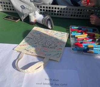 „Es ist toll, mit so vielen Konfis und einem tollen Team unterwegs zu sein und zu erleben, wie manche bei meinem Improvisations- und Tanzworkshop über sich hinausgewachsen sind“, sagt der Brensbacher Pfarrer Matthias Kraft, der auch Tanzpädagoge ist. „Das macht Lust und Mut zu mehr gemeinsamen Projekten.“ Im Workshop zu Klimakrise und Nachhaltigkeit wurden nach einem inhaltlichen Einstieg Taschen gestaltet. Zwei Ehrenamtliche des Repair-Cafés im GenerationenNetz Reichelsheim hatten dafür extra 60 Taschen aus gebrauchten Stoffen genäht. „Ich habe eine große Ernsthaftigkeit erlebt. Die Jugendlichen machen sich viel mehr Gedanken um nachhaltigen Konsum und verantwortungsvollen Umgang mit den Ressourcen dieser Erde als die Erwachsenen manchmal annehmen. Viel Freude hat mir gemacht, dass so viele mit großer Begeisterung die aus alten Tischdecken und alter Bettwäsche genähten Taschen mit bunten Symbolen gestaltet haben“, sagt Dr. Waltraud Frassine, Ehrenamtliche aus Reichelsheim und Ehrenamtskoordinatorin im GenerationenNetz Reichelsheim.